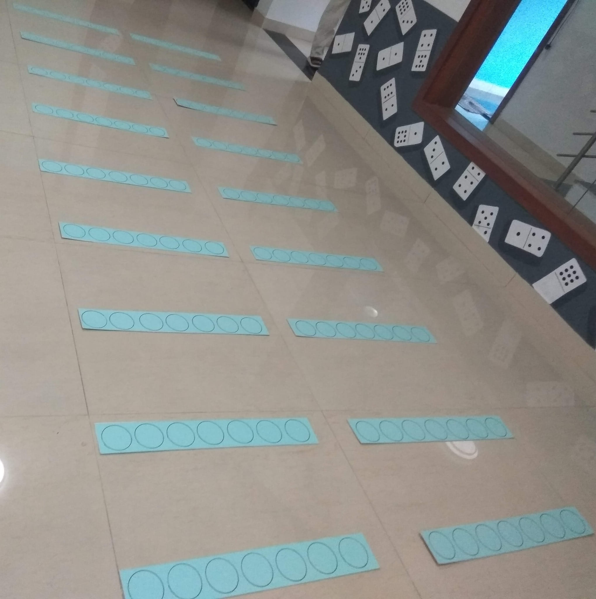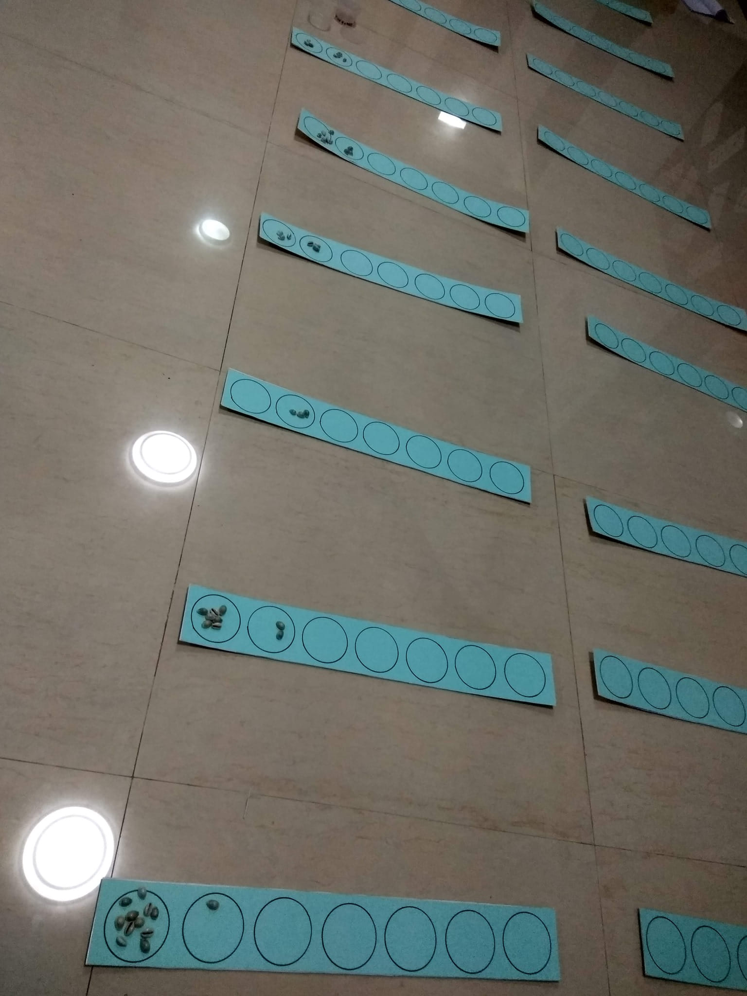 A 10 x 2 grid with 7 hole boards. The task: each row in column 1 holds the value for 1 ← n machine for a random number that we picked (hints are in pictures) where n is 2 through 10 and 16.